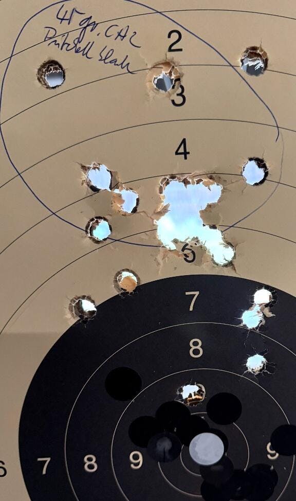 So - heute hatte ich längere Zeit (ungefähr anderthalb Stunden) auf dem Schießplatz in Neuhaus am Rennweg die Gelegenheit, auf der 50 m Bahn die Pritchett-Geschosse von G & M auszuprobieren. Dabei ist zu sagen - egal ob man sie mit einer einfachen Fettung verschießt oder in gefettete Papierpatronen eingebettet: Es ist eine Lust. Die Trefferlage entnehmt vom obigen Foto.
